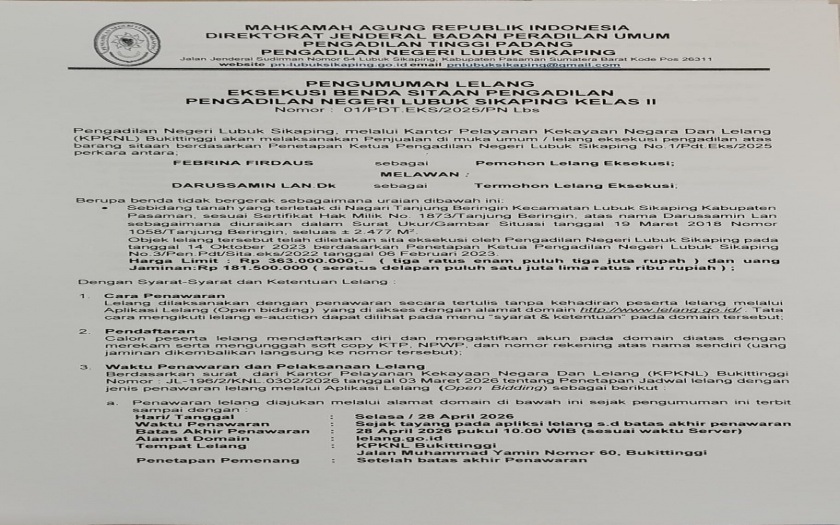 Pengumuman Lelang Pertama Eksekusi Nomor : 01/PDT.EKS/2025/PN Lbs