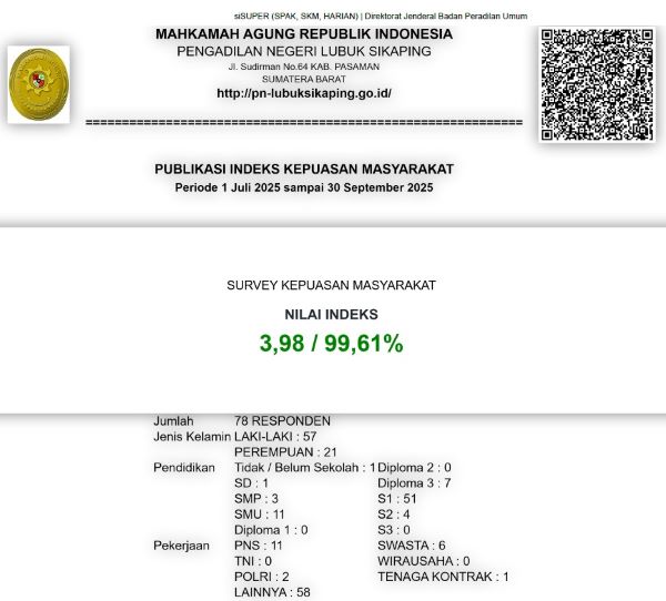 Nilai Indeks Kepuasan Masyarakat (IKM) = 3,98 / 99,61%